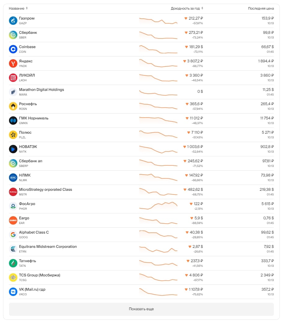Дохідність цінних паперів на біржі сумарно за рік обвалилися мінімум на -46%, максимум - на -73%.