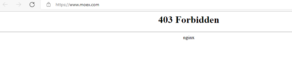 Станом на 13 годину за київським часом Мосбіржа закрила доступ до даних біржі. Сайт видає помилку 403 Forbidden. Це означає, що для відвідування сайту потрібно отримати спеціальний дозвіл адміністратора.