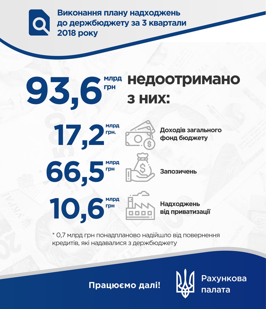 У той же час, більше плану на 0,7 млрд надійшло коштів від повернення кредитів, які надавалися з державного бюджету. Пацкан нагадав, що загальне невиконання плану надходжень загального фонду державного бюджету в першому кварталі склало 66 млрд грн, у першому півріччі - 74 млрд грн.