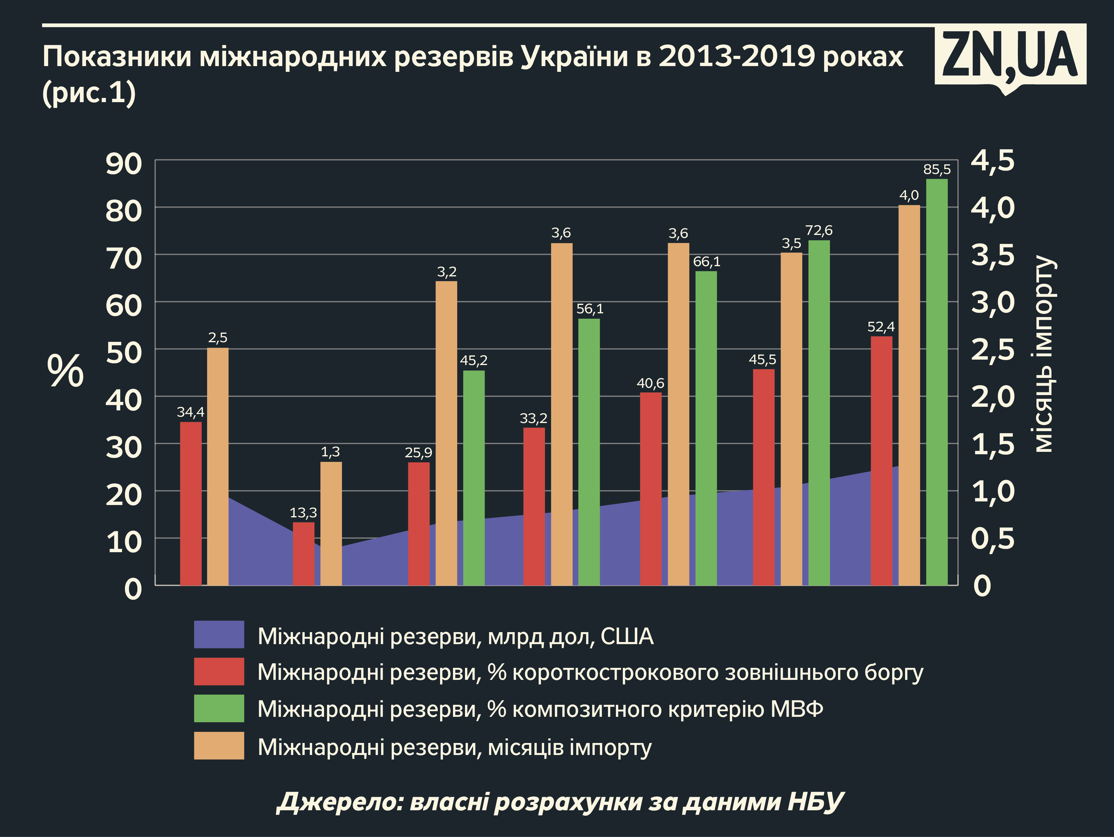 "Базові показники адекватності міжнародних резервів (у відсотках до короткострокового зовнішнього боргу і у відсотках до нормативу МВФ) перебували на незадовільному рівні. Відношення резервів до короткострокового зовнішнього боргу на кінець 2019 року склало 52,4% при гранично допустимому рівні 100% (див. рис. 1). Фактичний обсяг міжнародних резервів України також знаходився на рівні 85,5% композитного критерію МВФ, відстаючи на 14,5% від нормативного значення", - пише автор.