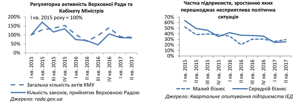 "За результатами квартального опитування ІЕД, частка МСП, які вважають, що несприятлива політична ситуація негативно впливає на їхній розвиток, дещо зросла в другому кварталі 2017 року до 30% малих та 26% середніх підприємств. Це, можливо, пояснюється протистоянням між Парламентом та урядом щодо медичної, пенсійної та земельної реформ", - йдеться у моніторингу.
