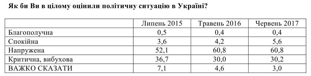 Як зазначають соціологи, оцінка ситуації зовсім не змінилася за останній рік, а у порівнянні з липнем 2015 року на 7% зменшилася оцінка ситуації як критичної і, відповідно, на 9% зросло визначення ситуації як напруженої.