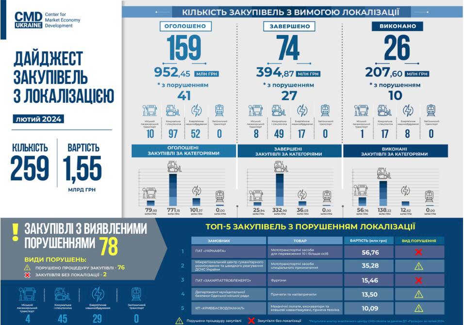 У лютому поточного року на платформі Prozorro опубліковано інформацію про 259 закупівель товарів на суму 1,55 млрд гривень, на які розповсюджується вимога локалізації. З них 78 тендерів (30,1%) відбулись з порушенням процедур та законодавства про локалізацію. Про це повідомляє Центр розвитку ринкової економіки (CMD-Ukraine).