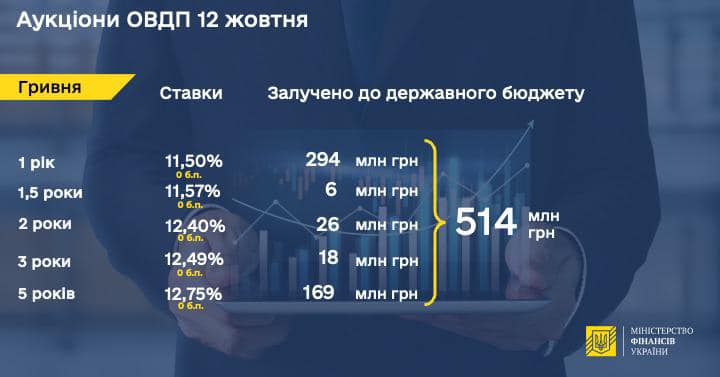 На вчорашніх аукціонах по продажу облігацій внутрішньої держпозики (ОВДП), 12 жовтня, Мінфін продав і залучив до держбюджету 514 мільйонів гривень. Про це повідомляє прес-служба Мінфіну в Facebook.