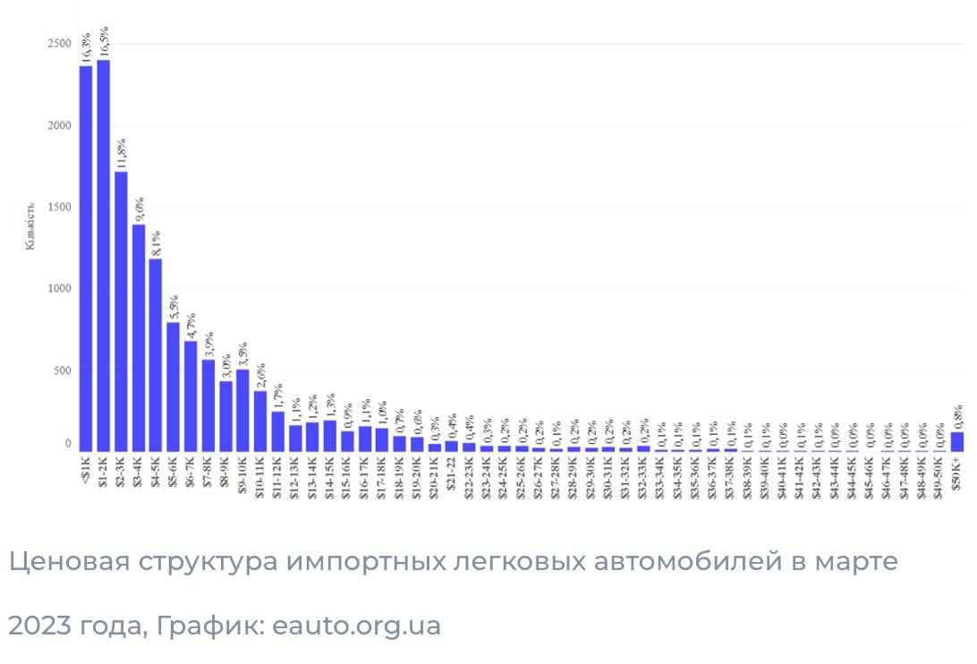 Усього 62,3% усіх імпортних легкових автомобілів упродовж березня коштували менше $5 тисяч, а менше $10 тисяч — 82,9%.