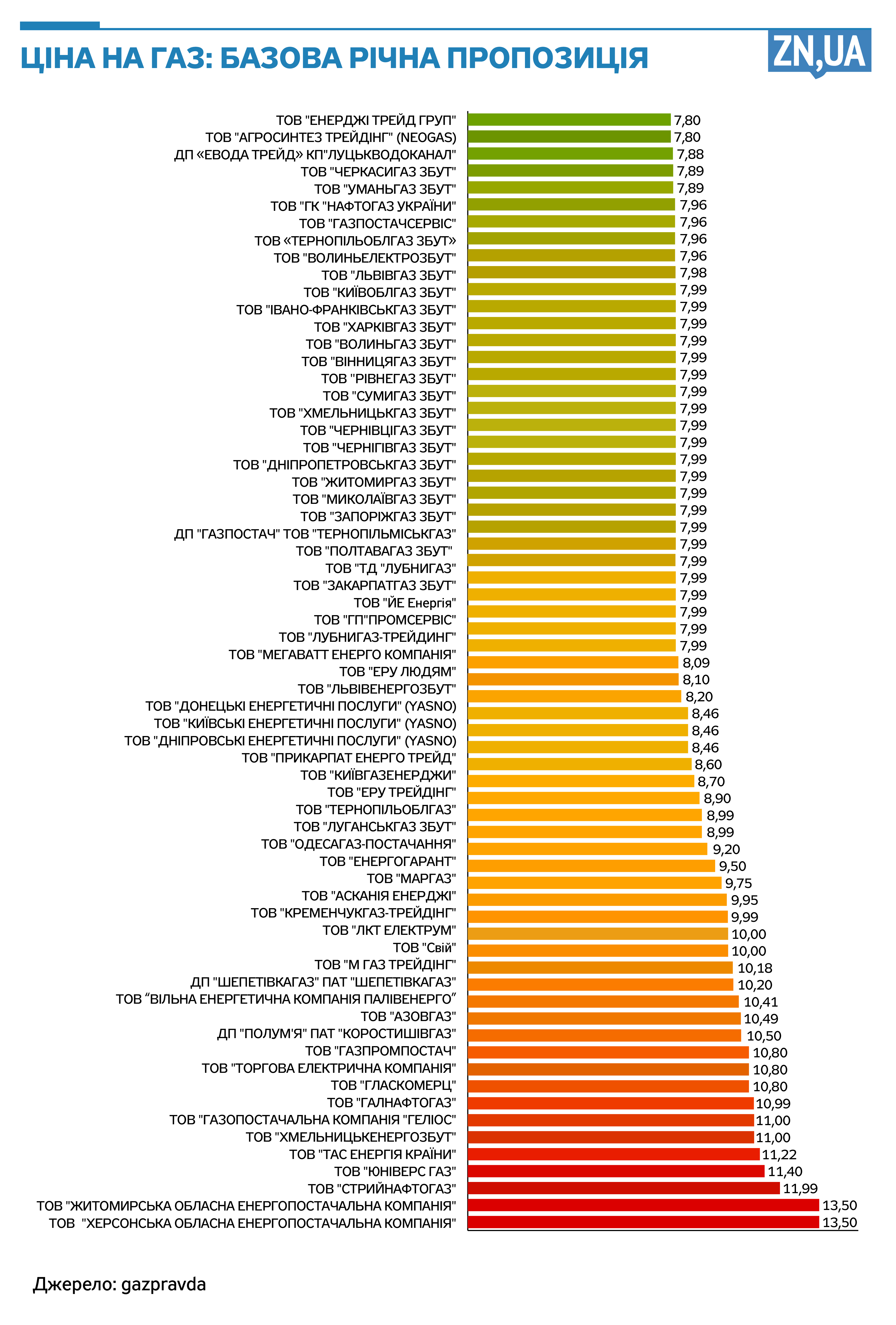 Найнижча ціна у пропозиції компанії "Енерджі Трейд Груп" (ETG.UA) - 7,799 грн за куб. Тільки на 0,001 грн. більше (7,80 грн. за куб) просить компанія Neogas. Потім іде "Евода Трейд КП Луцькводоканал" (7,88 грн за кубометр), "Черкаси Збут" та "Уманьгаз Збут" (7,89 грн за кубометр). "Газопостачальна компанія "Нафтогаз України" запропонувала традиційні 7,96 грн. за кубометр. Аналогічну ціну виставили "Газпостачсервіс" та "Тернопільоблгаззбут".