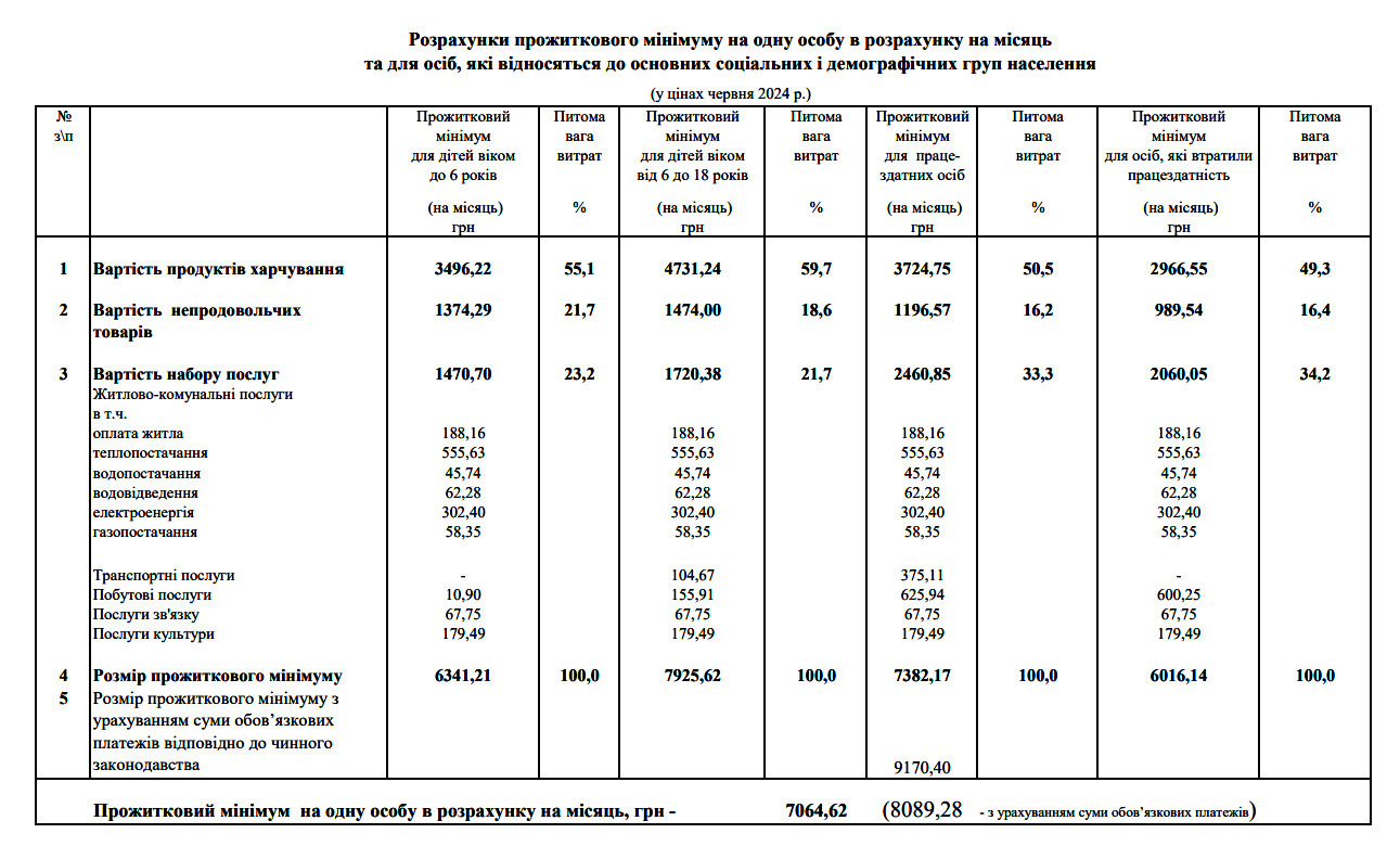 “Міністерство соціальної політики надало інформацію щодо фактичного розміру прожиткового мінімуму на одну особу, а також для тих, хто відноситься до основних соціальних і демографічних груп населення, у цінах червня 2024 року, розрахованого відповідно до статті 5 Закону України “Про прожитковий мінімум”.