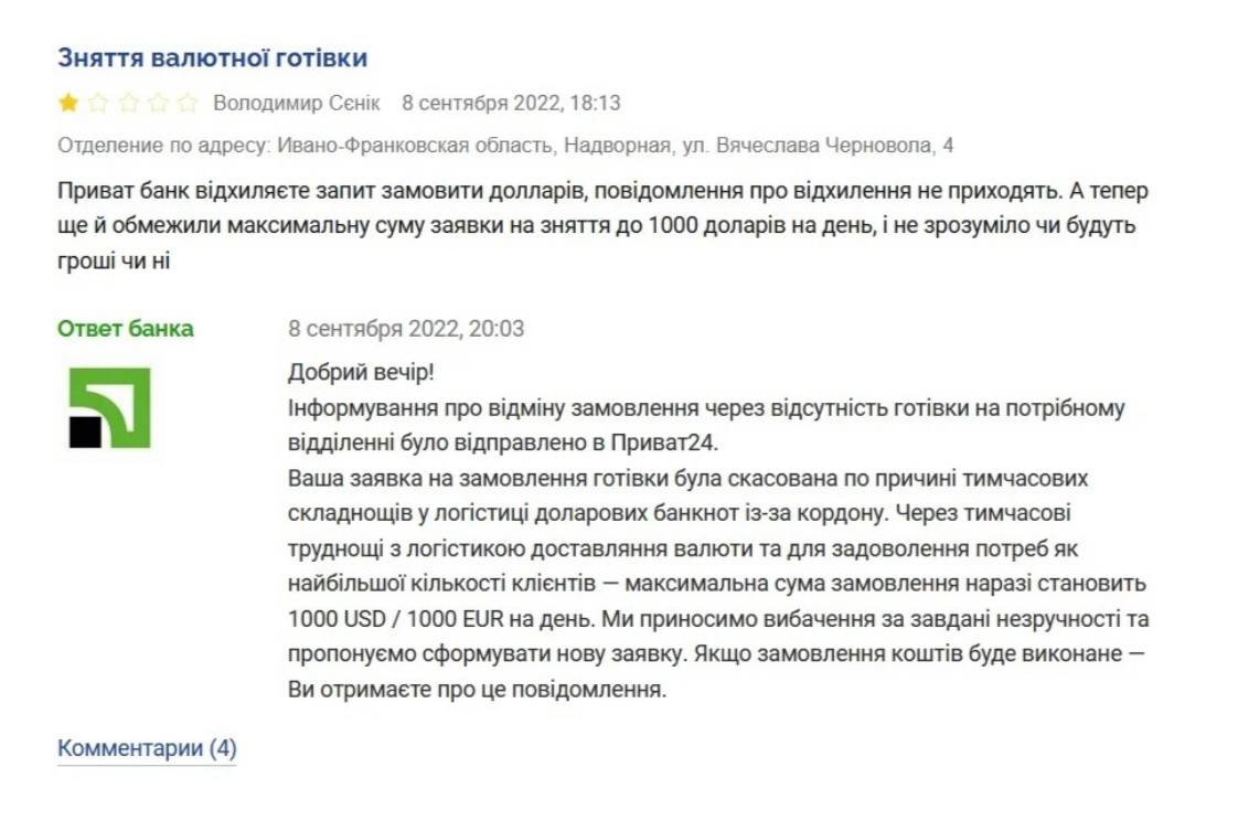 Відповідно до пояснення менеджеру фінустанови, банк ввів обмеження на видачу доларові з рахунків клієнтів через дефіцит валютної банкноти, що у свою чергу виник через війну в Україні. Наразі існує проблема із доставкою готівки з-за кордону.