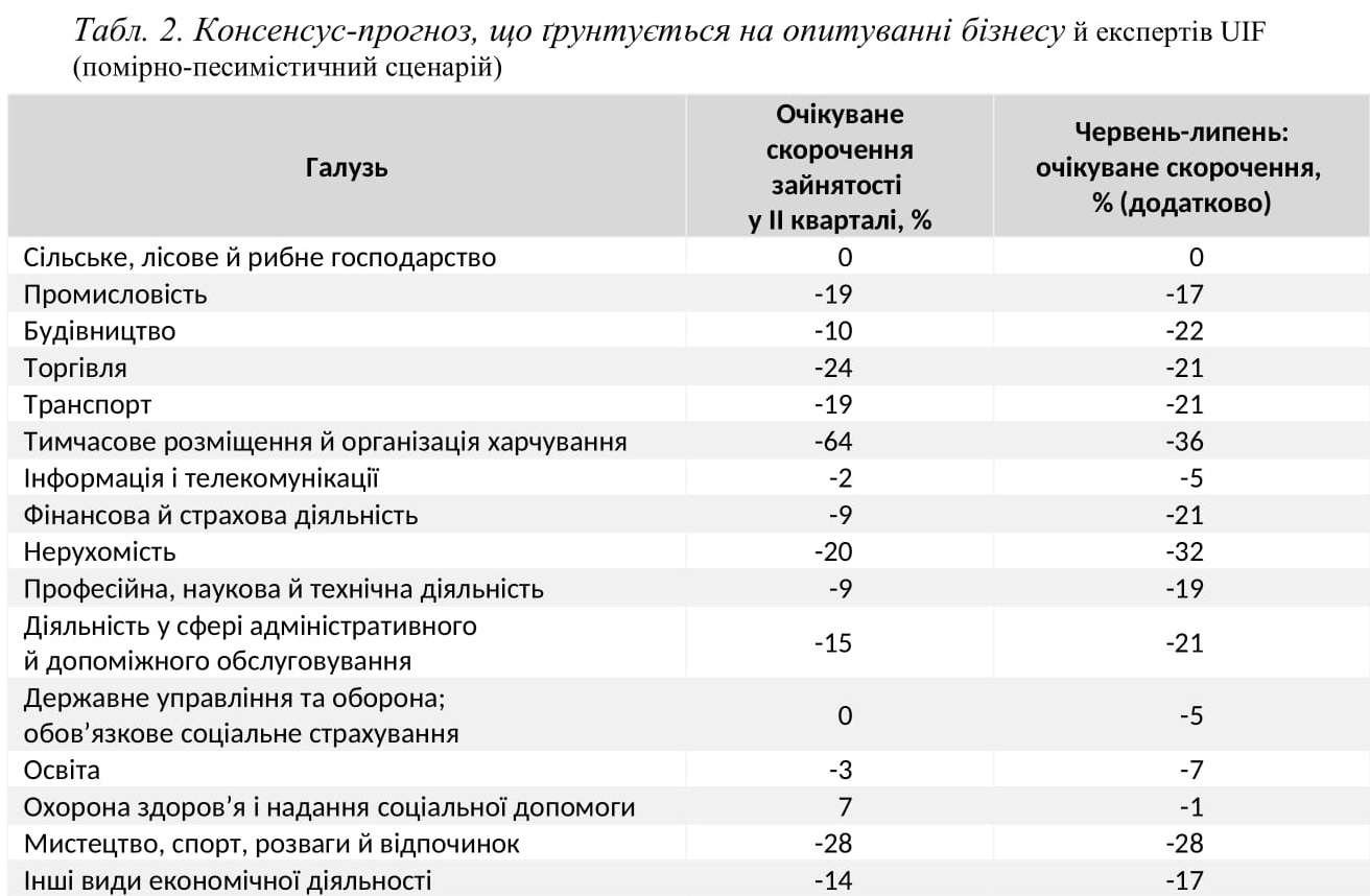 6. Очікуване скорочення зайнятості в розрізі галузей наведено в табл. 2.