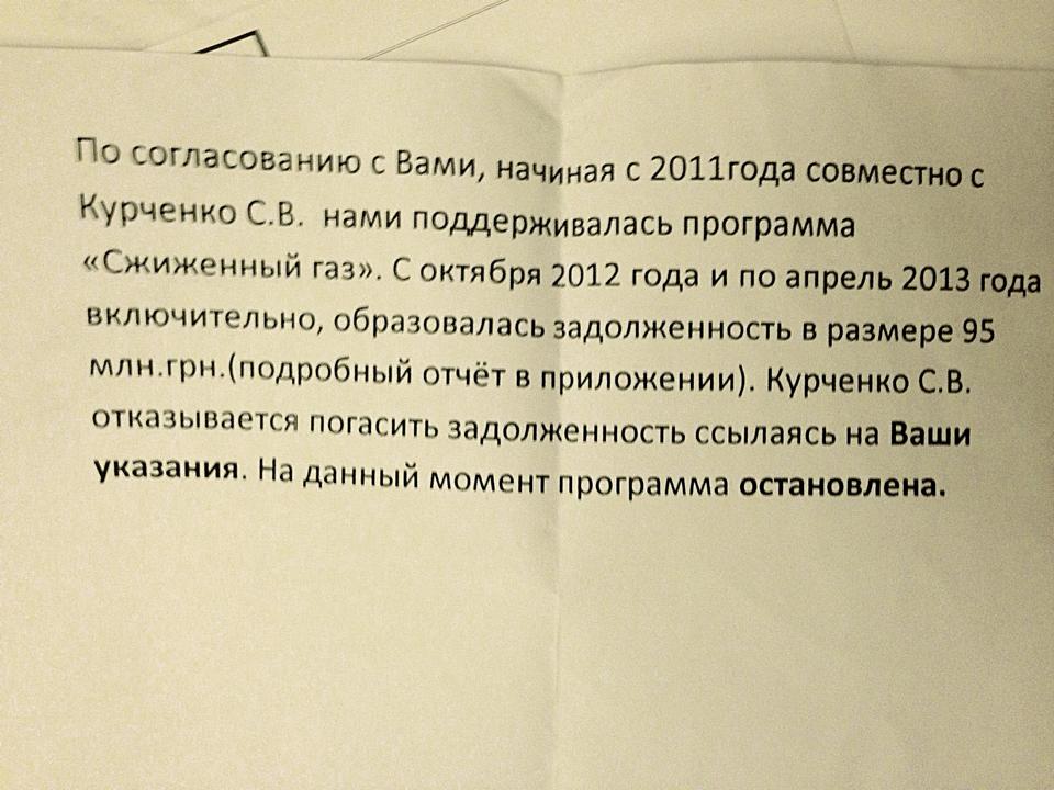 "За узгодженням з Вами, починаючи з 2011 року спільно з Курченком С.В. нами підтримувалася програма "Скраплений газ". З жовтня 2012 року по квітень 2013 року включно утворилася заборгованість у розмірі 95 млн грн (детальний звіт у додатку). Курченко С.В. відмовляється погасити заборгованість, посилаючись на Ваші вказівки. На даний момент програму зупинено", - йдеться у записці.