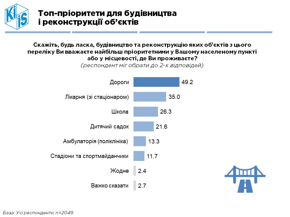 Якщо говорити про пріоритетність, то найбільше від «Великого будівництва» чекають ремонту доріг (49,2%), лікарень (35%) і шкіл (26,3%).