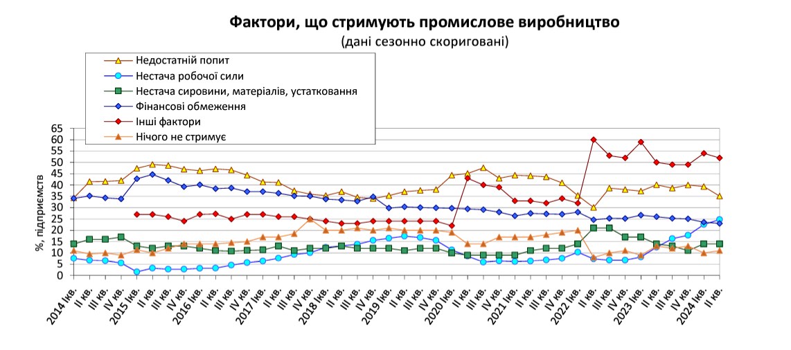 Підприємств, які постійно відчувають проблему відсутності попиту складає 35%. З 2023 року до другого кварталу 2024 року стрімко зріс показник фактору недостатності кваліфікованих працівників – з 5% до 25%.