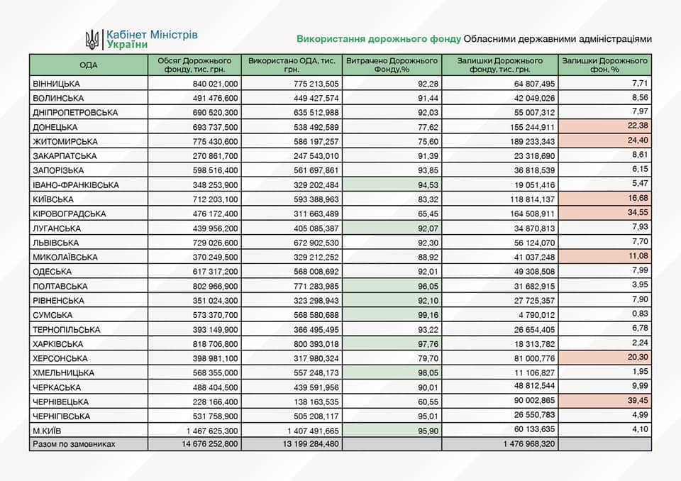 Найгіршою областю за цим показником стала Чернівецька. Там на ремонт доріг не зуміли витратити 90 млн грн (39% Дорожнього Фонду).