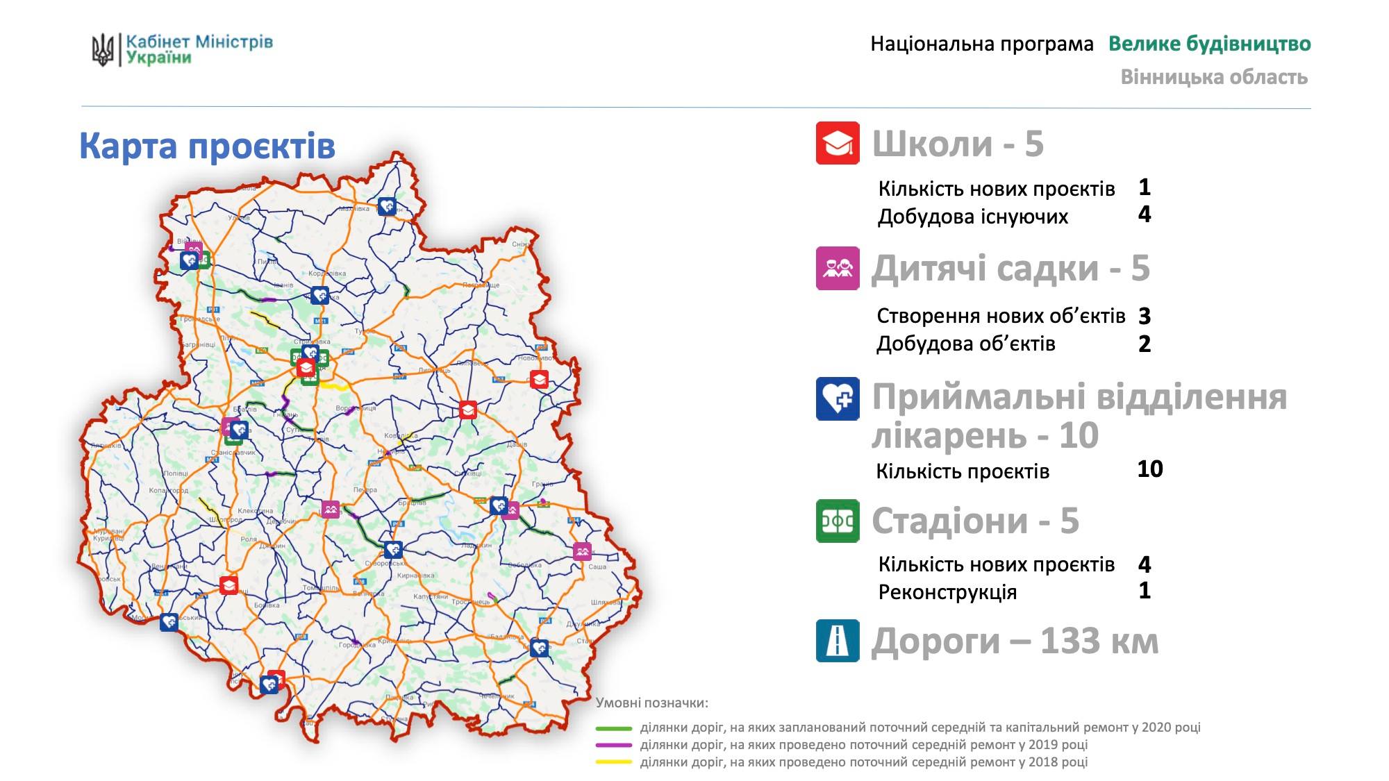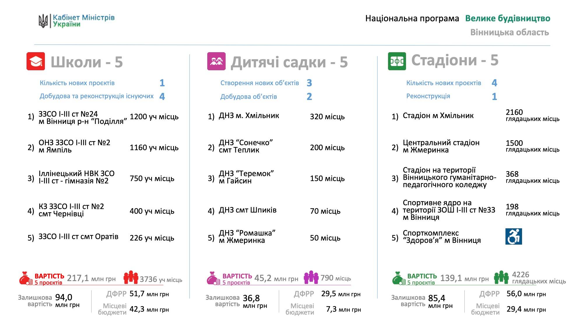 Вінницька область в ході виконання перерахованих планів планує побудувати або капітально відремонтувати 5 шкіл, 5 садочків, 5 стадіонів і 10 приймальних медичних відділень.