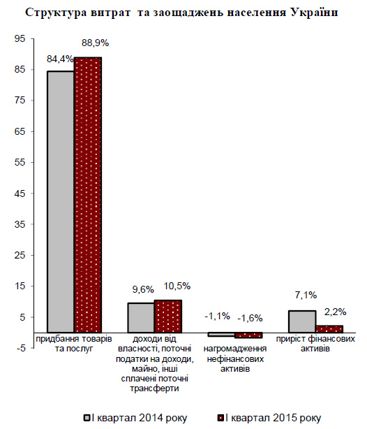 Примітно, що в структурі доходів на 1,2% скоротилася частка зарплати в порівнянні з першим кварталом-2014. Обсяги отримання соцдопомоги залишилися на колишньому рівні (див. табл.1).