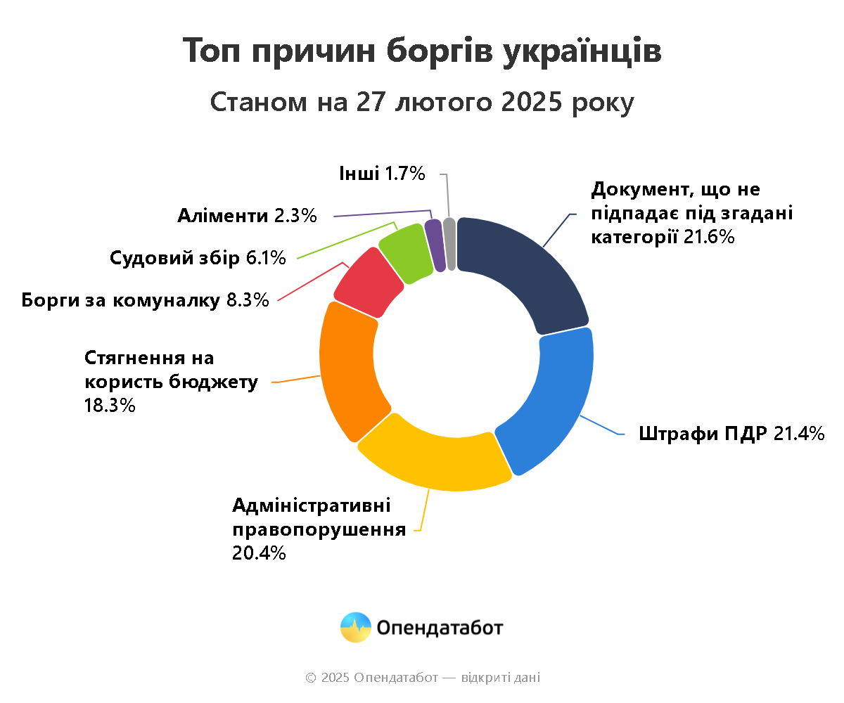Найчастіше українці потрапляють до реєстру за несплачені штрафи за порушення правил дорожнього руху — 1,9 млн. або 21,4% від загальної кількості. Ще 20% становлять борги за адміністративні правопорушення: понад 1,8 млн. Замикають трійку стягнення на користь державного бюджету – 18% або 1,6 млн.