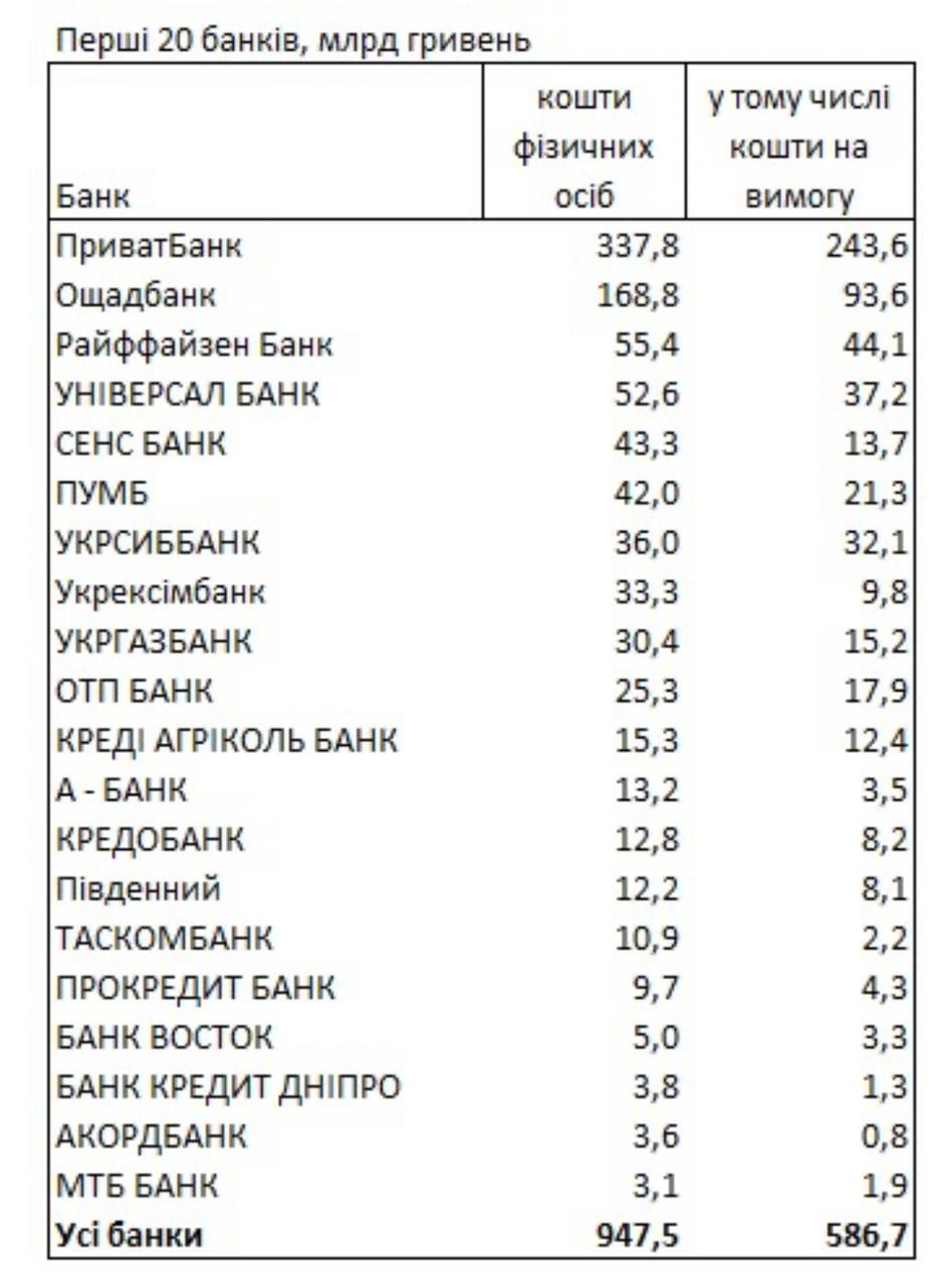 Станом на 1 травня 2023 року в 65 банках зберігалося 947,5 млрд гривень коштів фізичних осіб. Водночас частка депозитів «до запитання» - 586,7 млрд гривень. Найбільше вкладів у державному ПриватБанку - 337,8 млрд гривень. Про це йдеться в даних Національного банку України (НБУ).