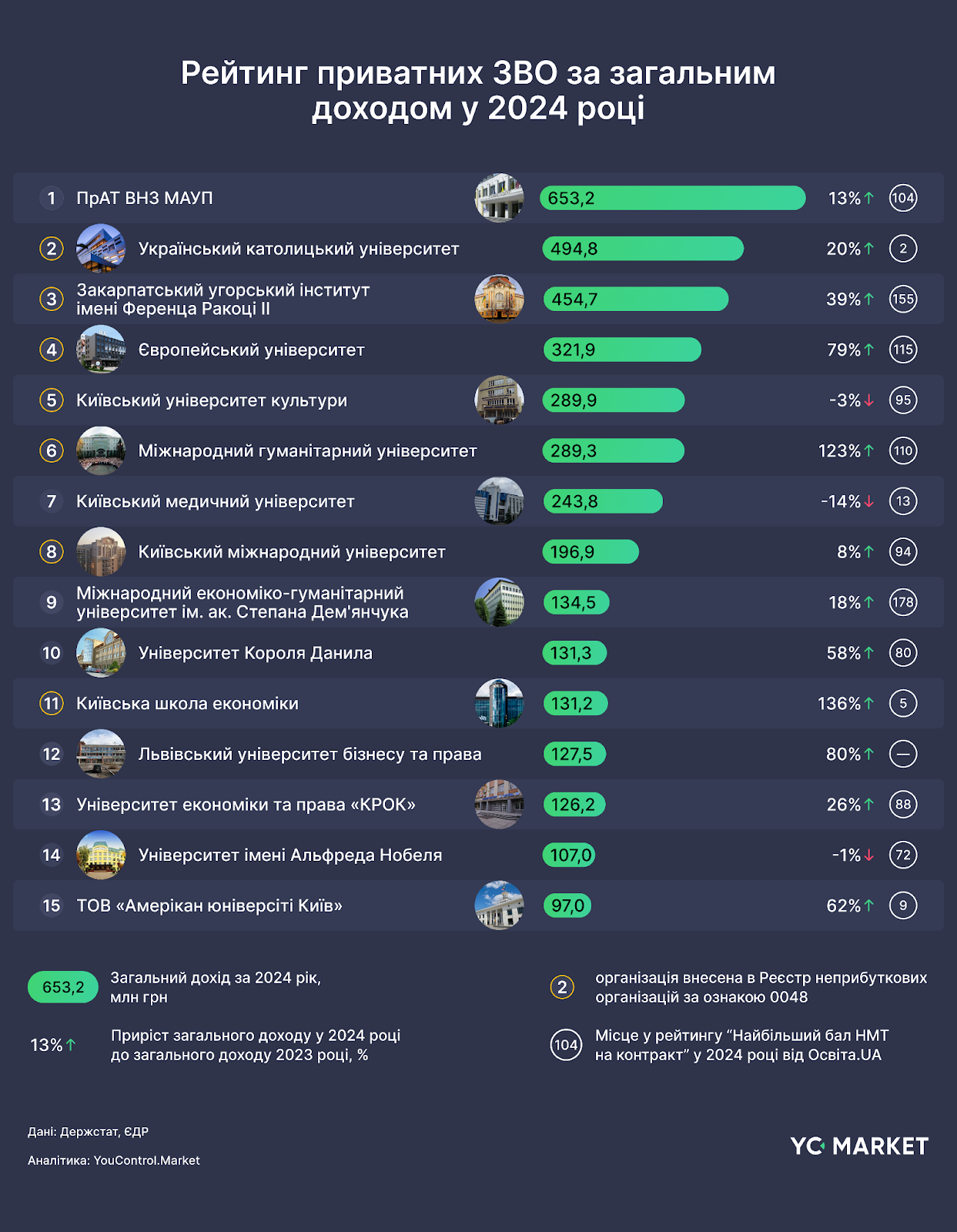 Загалом 15 найбільших приватних університетів заробили у 2024 році близько 3,8 млрд грн, з яких на МАУП припало понад 17% – 653,2 млн грн.