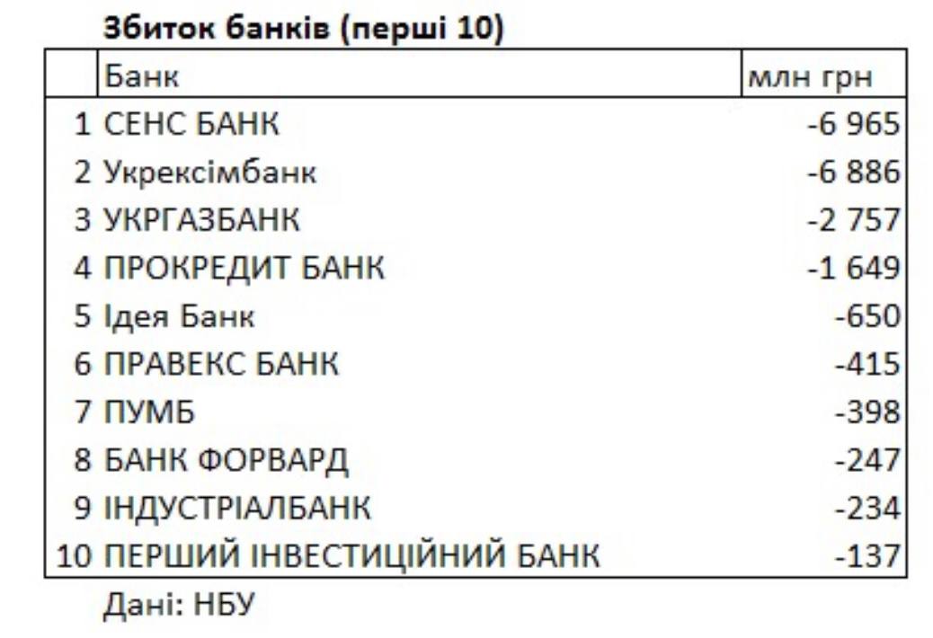 Найбільший збиток показав банк близьких до Путіна російських олігархів Сенс Банк (раніше - Альфа-банк) - 6,965 млрд грн. Далі йдуть державні Укрексімбанк - 6,886 млрд грн та Укргазбанк - 2 757 млрд грн.