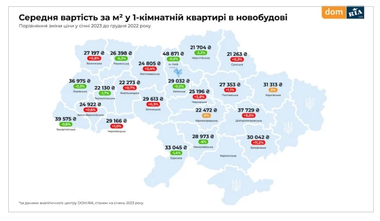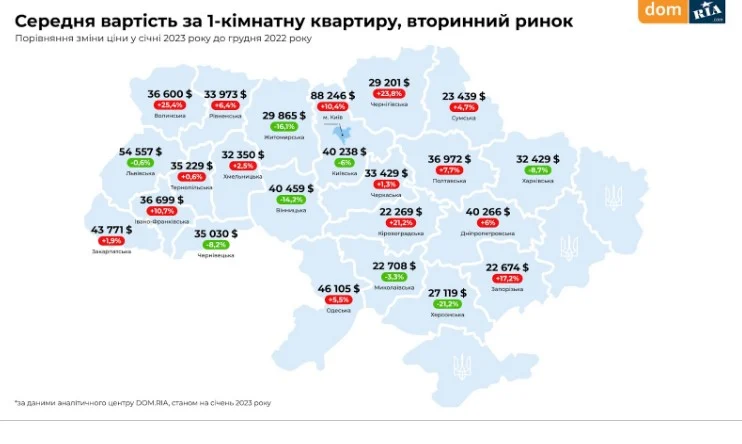 Найбільше падіння середньої вартості 1-кімнатної квартири (січень 2023 року до грудня 2022 року) зафіксовано на Херсонщині — 21%, на Житомирщині — 16% та на Вінниччині — 14%.