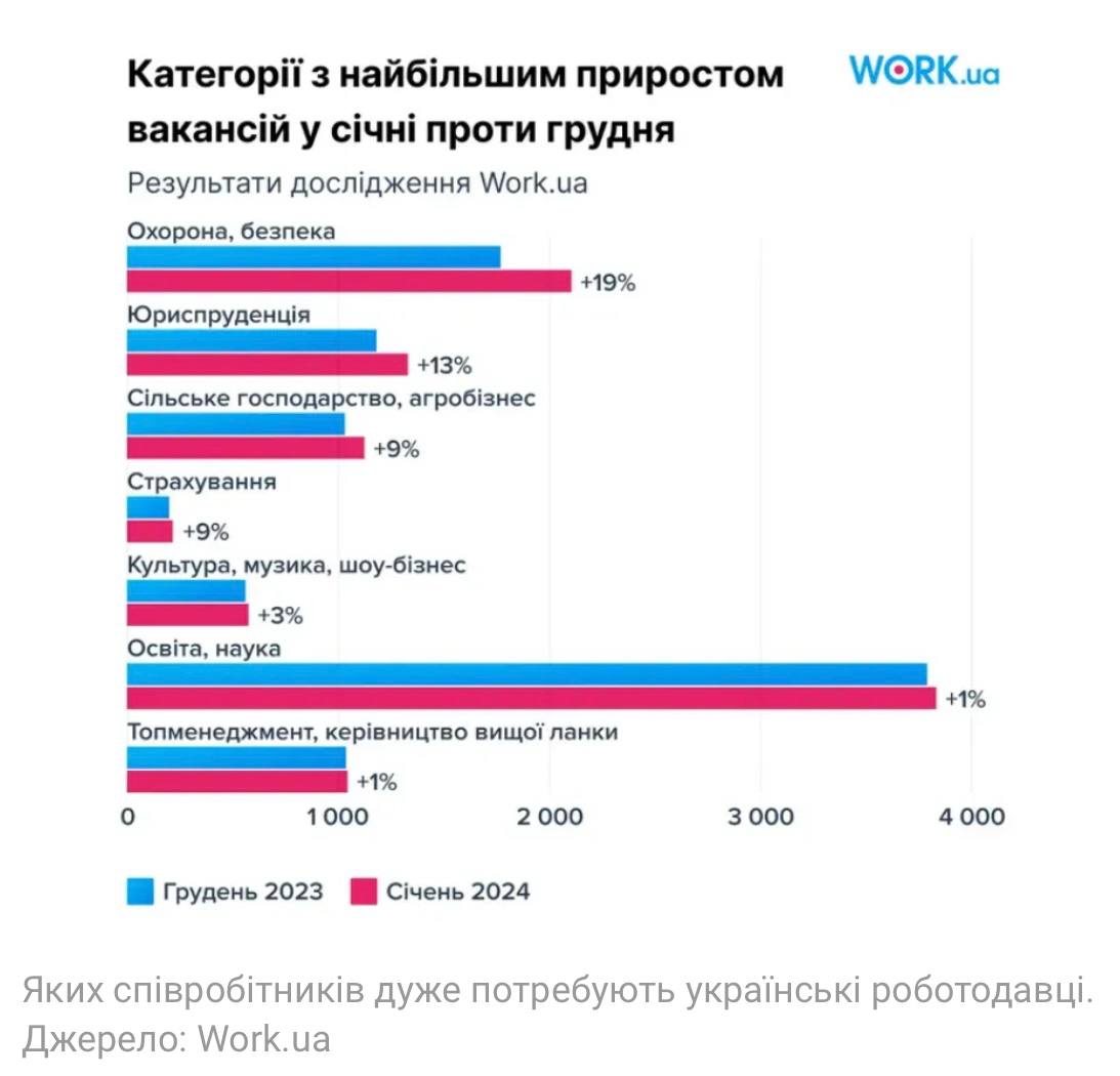 За даними OBOZ.UA, яке посилається на кадрові портали, українські роботодавці почали активніше шукати працівників одразу в 7 галузях. Найбільше кількість вакансій у січні 2024 року зросла для фахівців сфери охорони та безпеки – одразу на 19%, порівняно з груднем-2023.