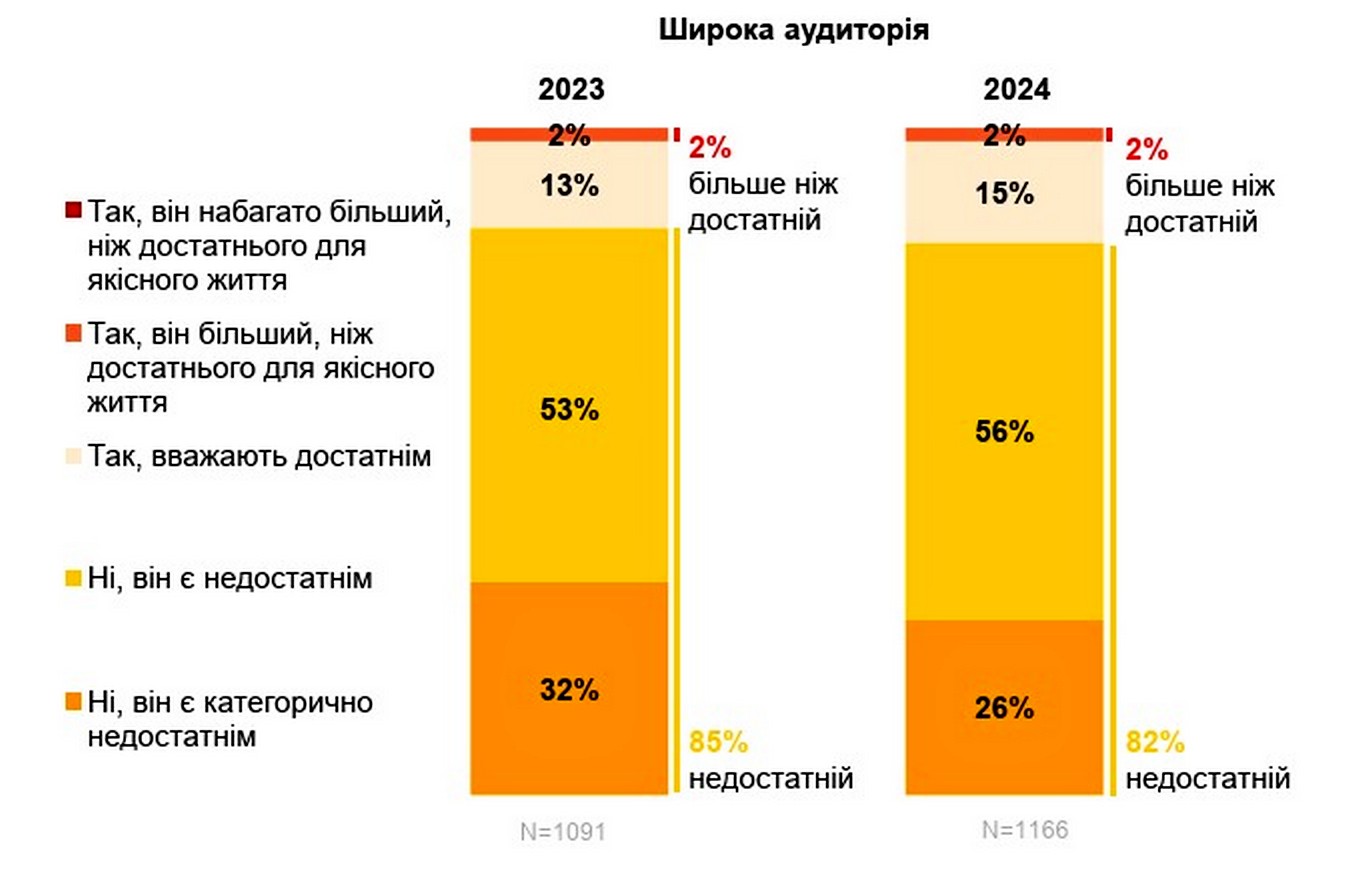 82% українців вважають, що рівень матеріального забезпечення недостатній для гідного життя. Водночас менша частина респондентів вважає, що рівень доходів категорично недостатній – 26%, а інша частина, що цей рівень є просто недостатнім. Таких респондентів – 56%. Результати дослідження опублікували в опитуванні компанії Gradus “Барометр якості життя 2024”.