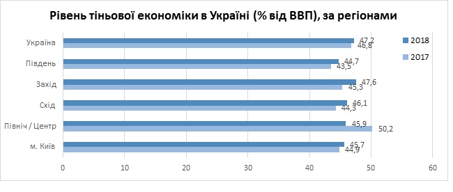 За даними дослідження, по всіх регіонах України спостерігається зростання рівня тіньової економіки в середньому на 1,5% за винятком Півночі та Центру, де відбулося скорочення аж на 4,3%.