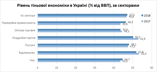 Найбільш тінізованими секторами економіки виявилися роздрібна торгівля і будівництво: масштаби перевищують 50%. Хот у дослідженні відзначають, що, на відміну від інших секторів, тут в 2018 році відбулося зниження рівня тіньової економіки в порівнянні з 2017 роком.