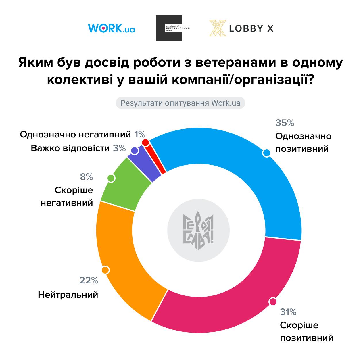 При цьому більшість із тих, хто вже приймав на роботу, співпрацював з ветеранами, визначають цей досвід як однозначно позитивний (35%), скоріше позитивний (31,5%) або нейтральний (22%). Тільки 8% опитаних вибрали варіант відповіді «Скоріше негативний», говорячи про роботу з колишніми військовими.