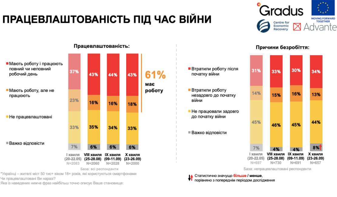 Рівень працевлаштованості в Україні за підсумками вересня дещо збільшився і наразі складає 61%. Однак більшість працюючих українців говорять, що їх доходи зменшились. Такі дані дослідження соціально-політичних та міграційних настроїв українців під час війни, проведеного Gradus Research.