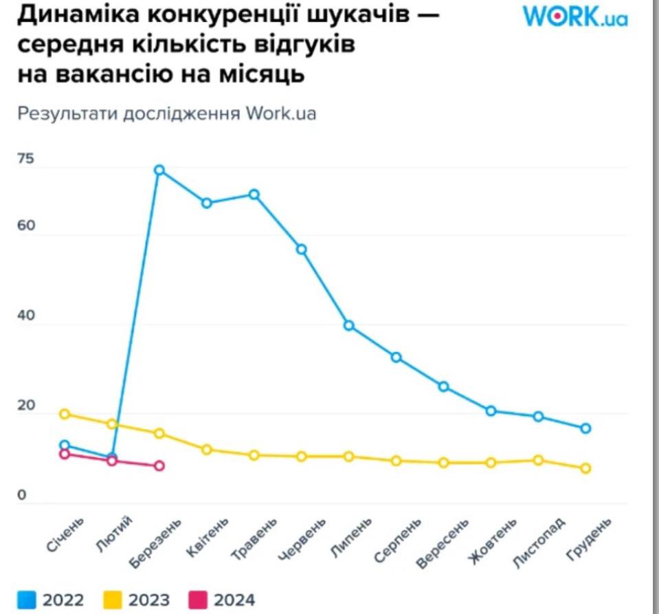 Так, найбільший приріст пропозицій роботи у березні у таких регіонах: Тернопільська (+11%), Закарпатська (+8%), Полтавська (+7%), Кіровоградська (+7%), Хмельницька (+6%).
