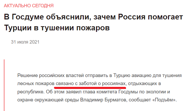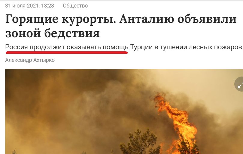 Надавати допомогу з гасінням пожеж Росія розпочала лише у липні 2021 року. При цьому всіляко підкреслювалося, що це допомога Туреччині з боку Росії.