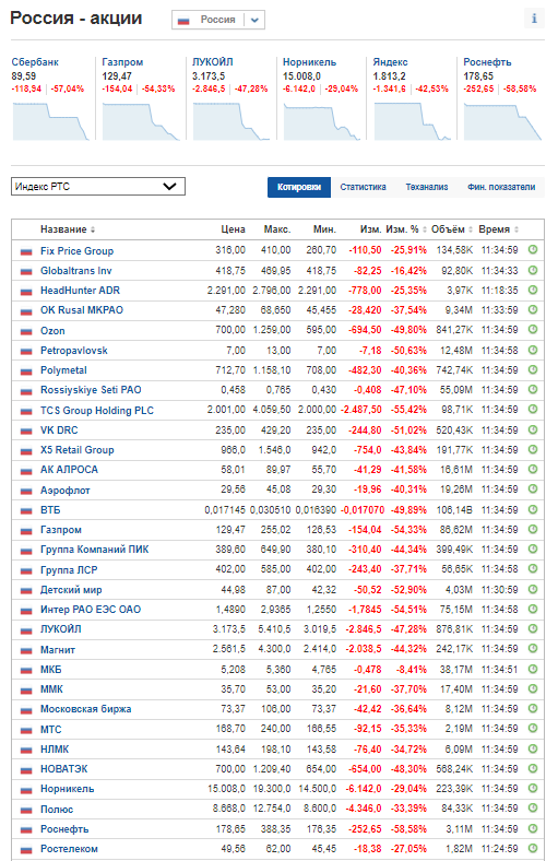 Падіння індексу Московської біржі не припиняється з ранку і ось-ось досягне психологічної відмітки у 50%. Суттєво знецінюється і російський рубль.