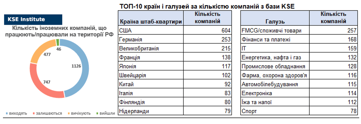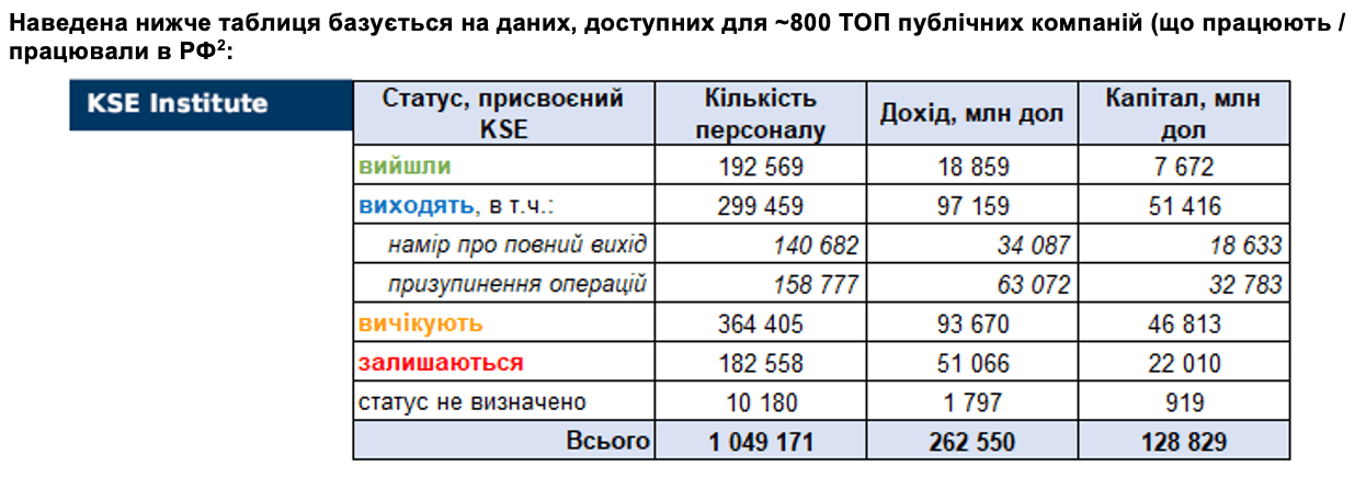 За даними KSE, 1 649 іноземних компаній вже скоротили, призупинили або припинили свою діяльність в Росії. Станом на 14 серпня компанії, які вже повністю вийшли з РФ, мали 192,6 тисяч осіб персоналу, $18,9 млрд річного доходу та $7,7 млрд капіталу.