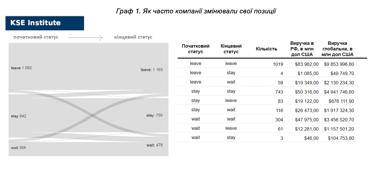 Попри заяви про рішучий розрив відносин з РФ, згодом ставало відомо, що вони продовжують підтримувати продукти, зберігати часткову активність тощо. Датасет KSE свідчить, що від 17 березня 2 066 компаній чи сервісів не змінювали позицію, 326 – змінювали.