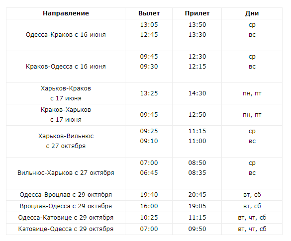 При цьому з Одеси рейси до Кракова будуть виконуватися по середах і неділях, до Вроцлава - по вівторках і суботах. У свою чергу Харків-Краків - по понеділках і п'ятницях, Харків-Вільнюс – по середах і неділях.