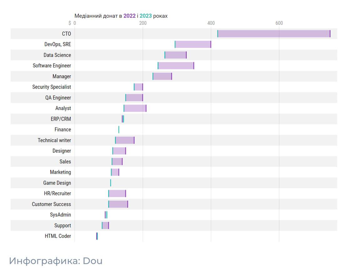 Розмір середньомісячної пожертвування за рік зменшився на 30%, з $270 минулого літа до $190 сьогодні. Менше стали донатити айтішники всіх спеціалізацій, тайтлів та місця проживання.