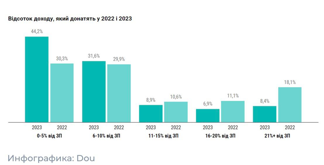 У 2022 році 40% айтішників донатили понад 10% свого доходу, а цього року таких 24%. Найчастіше айтішники віддають на благодійність до 5% доходу (44% донаторів), а ще 32% - від 6 до 10%. 2% перераховують понад 50% зарплати.