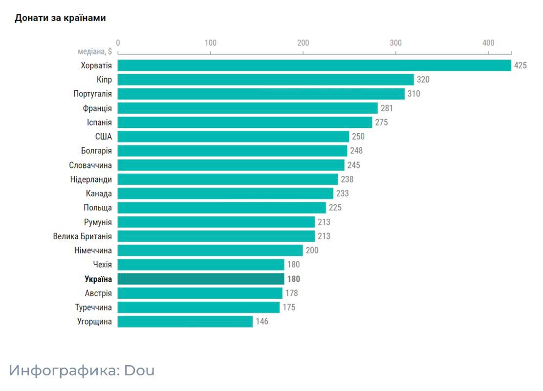 Розмір індивідуальних пожертв дуже різний: 25% фахівців із найменшими донатами віддають до $80 на місяць, а 25% із найбільшими — понад $420. 8% айтішників щомісяця жертвують понад $1000.