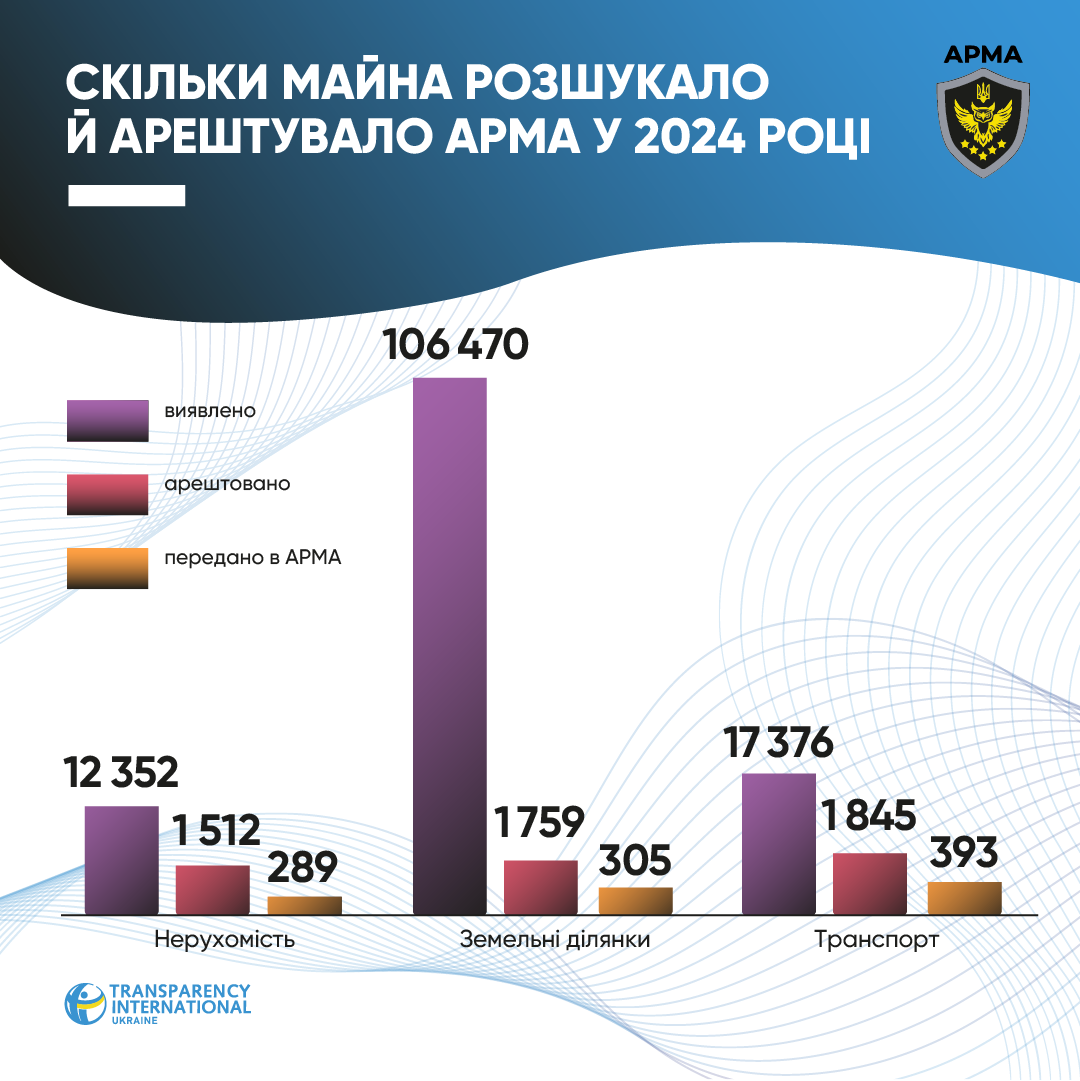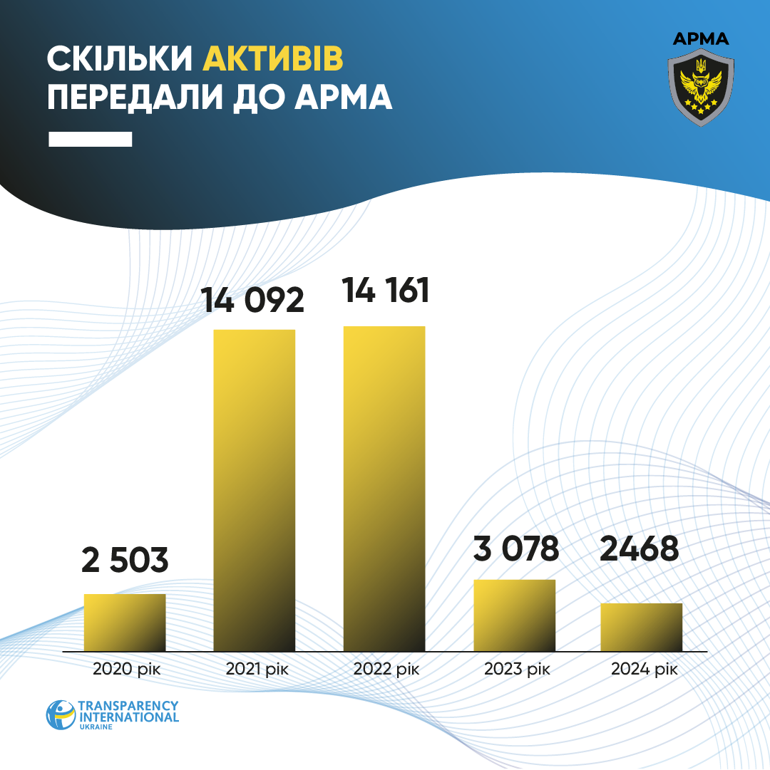 За даними звітності Національного агентства з питань виявлення, розшуку та управління активами, одержаними від корупційних та інших злочинів (АРМА), в 2024 році Агентство виявило та розшукало 141,5 тис. одиниць активів. Це більше, ніж 2023-го (96 тис.), але значно менше, ніж 2022-го (196,6 тис.). Про роботу АРМА під час війни читайте в статті Павла Демчука, старшого юридичного радника Transparency International Ukraine, - "Цифри без змісту — АРМА демонструє успіхи, не виконуючи своєї місії".