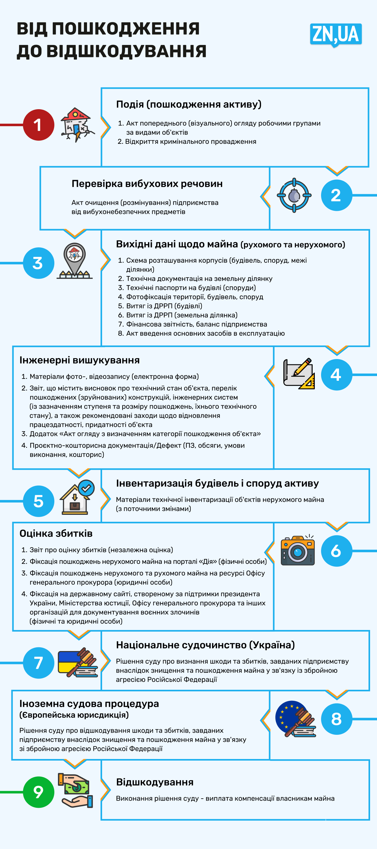 Спочатку юридичним особам необхідно підготувати всі документи щодо прав власності на довго- та короткострокові активи компанії, документи фінансової звітності з розшифровками та інші докази діяльності компанії, які буде використано для оцінки як прямих збитків, так і упущеної вигоди. Це можуть бути такі документи, як генеральний план забудови, інвентаризаційні відомості, технічні паспорти, кошториси, фотофіксація активів у поточному стані до пошкоджень, акти введення в експлуатацію, звіти про технічний стан активів, товарно-транспортні накладні, документи на придбання та будівництво активів тощо.