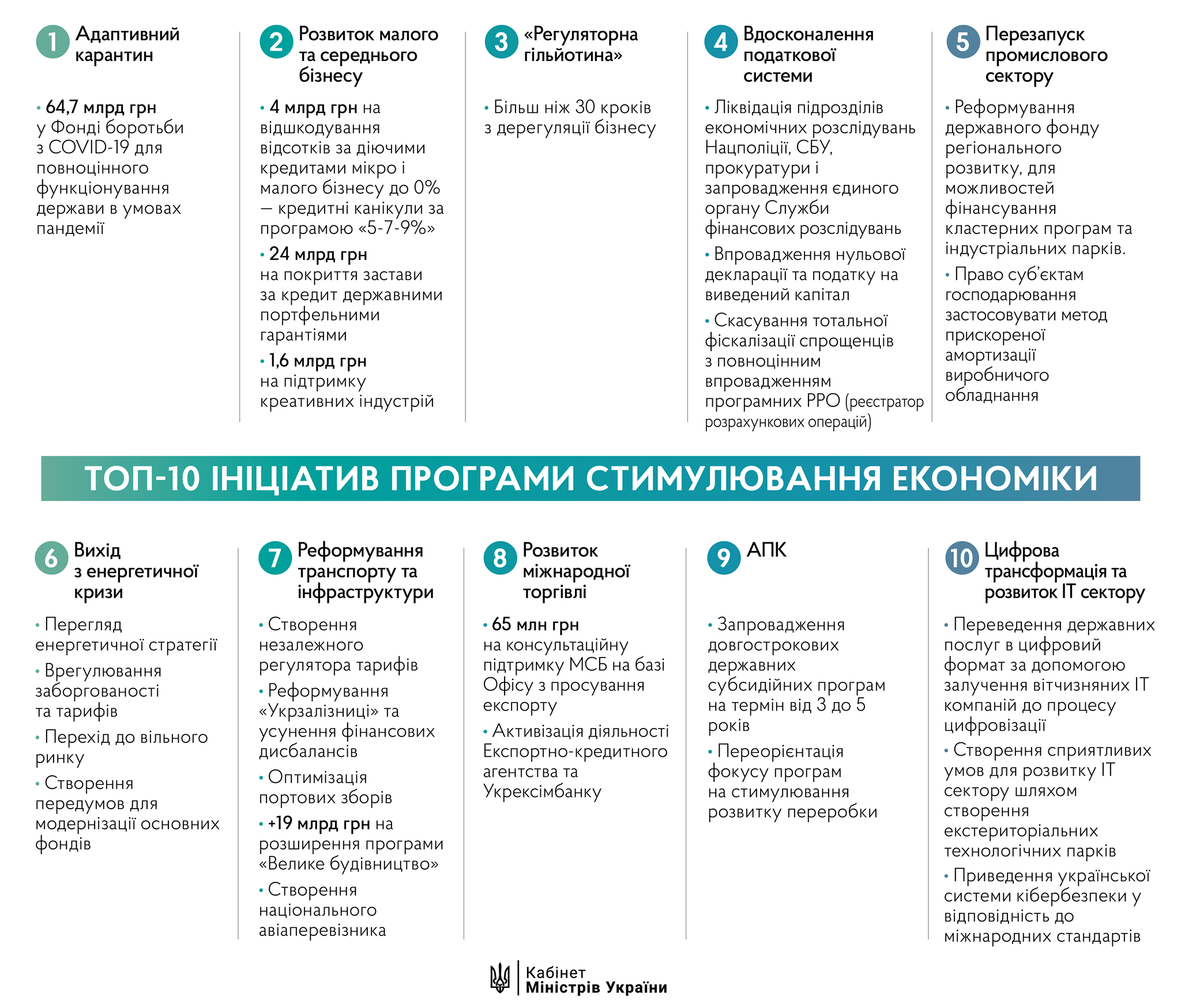 Прем'єр-міністр Денис Шмигаль опублікував 10 ініціатив програми стимулювання економіки, яку презентували минулого тижня.