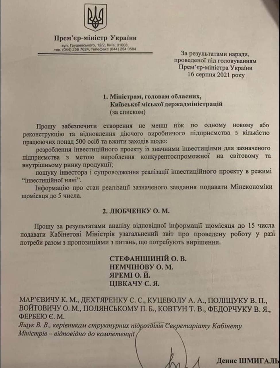 За підсумками чергового засідання прем'єр-міністр Денис Шмигаль зобов'язав міністрів, глав обладміністрацій і Київської міськадміністрації створити нові підприємства або відновити вже існуючі. Цікавлять підприємства з кількістю працівників від 500 осіб. Про це йдеться в документі, що є в розпорядженні ZN.UA.