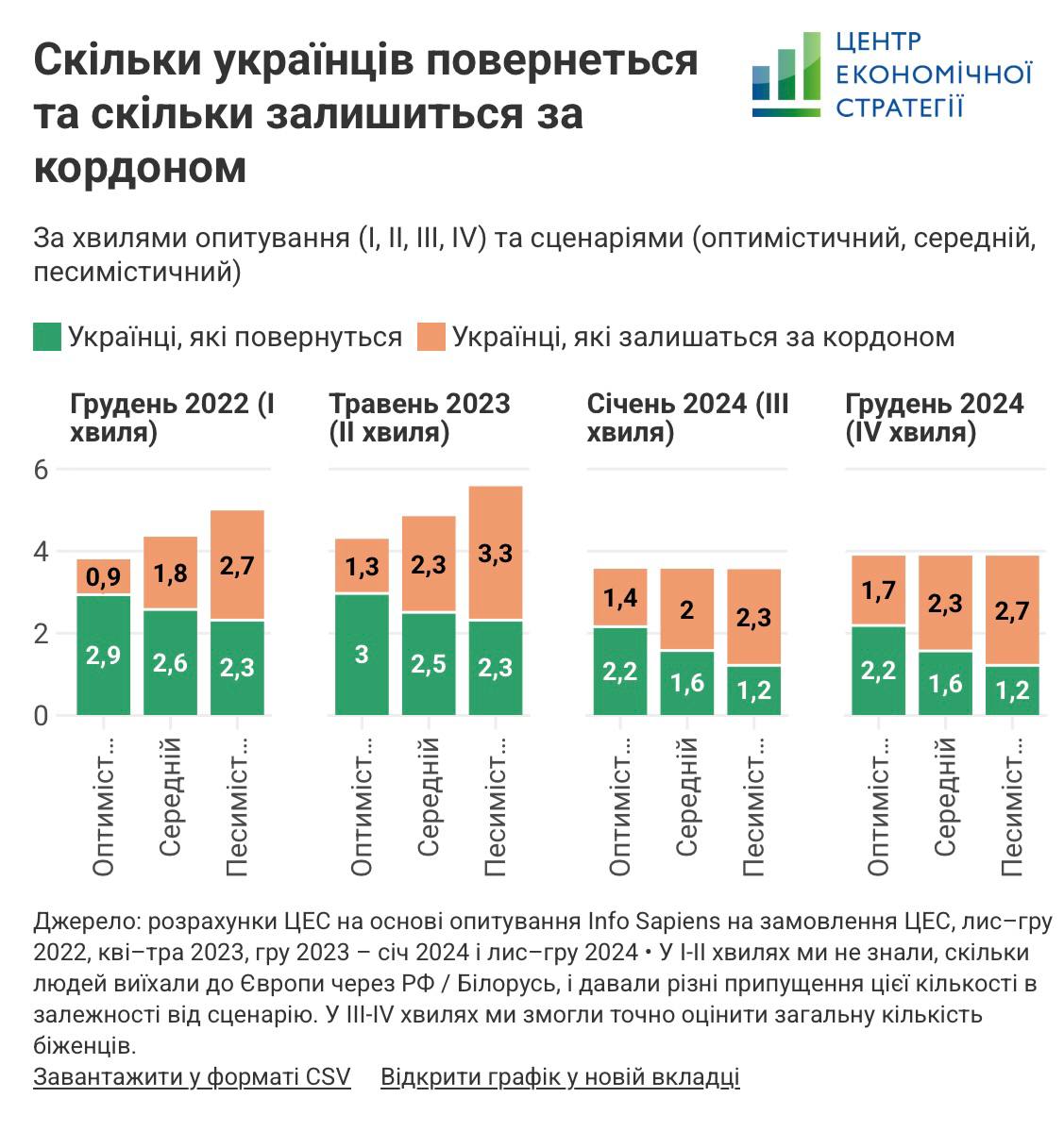 Навіть після завершення бойових дій за кордоном можуть залишитися від 1,7 до 2,7 млн громадян України. Більш того, за кордон додатково виїде ще 0,3 – 0,5 млн чоловіків. Про це свідчать результати дослідження дослідницькою агенцією Info Sapiens на замовлення Центру економічної стратегії.