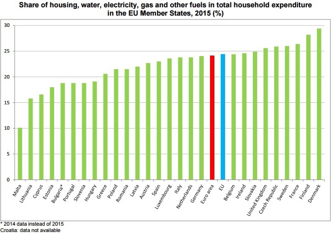 У 2005 році комунальна стаття витрат європейських домашніх господарств становила 22,5% від загальних витрат. У 2015 році вона збільшилася до 24,4%, тобто на 1,9%. Тенденція до збільшення витрат на житло і комунальні послуги спостерігається у всіх державах-членах ЄС.