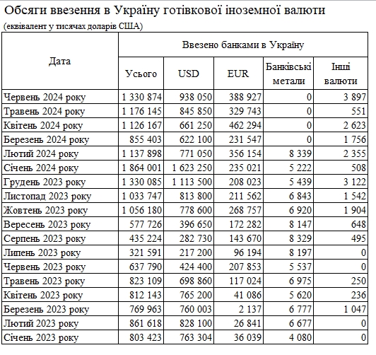 Обсяг іноземної валюти в формі готівки, яку банки ввезли до України у червні поточного року, складає 1,331 млрд доларів. Це на 13,2% більше, ніж місяцем до цього (1,176 млрд доларів). Про це йдеться в даних НБУ.