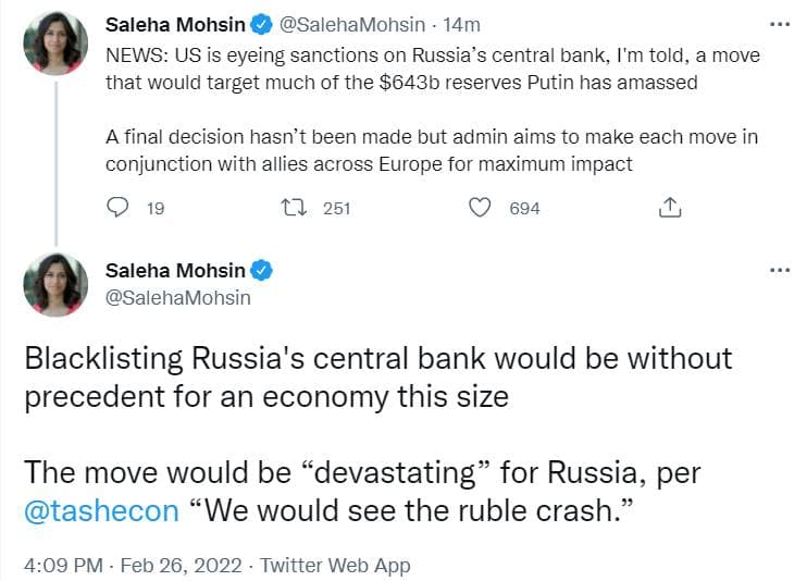 США розглядають можливість запровадження санкційних обмежень проти Банку Росії, що є центральним банком РФ. Про це написала вашингтонська кореспондентка Bloomberg Салеха Мохсін у своєму Twitter із посиланням на джерела.