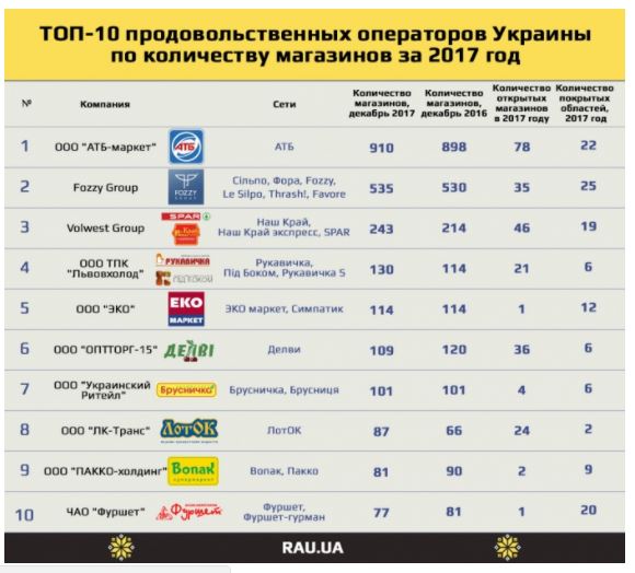 Мережа АТБ налічує 910 магазинів. На другому місці Fozzy Group, що управляє мережами "Сільпо", "Фора", Thrash!, Le Silpo, Favore, - 535 об'єктів.