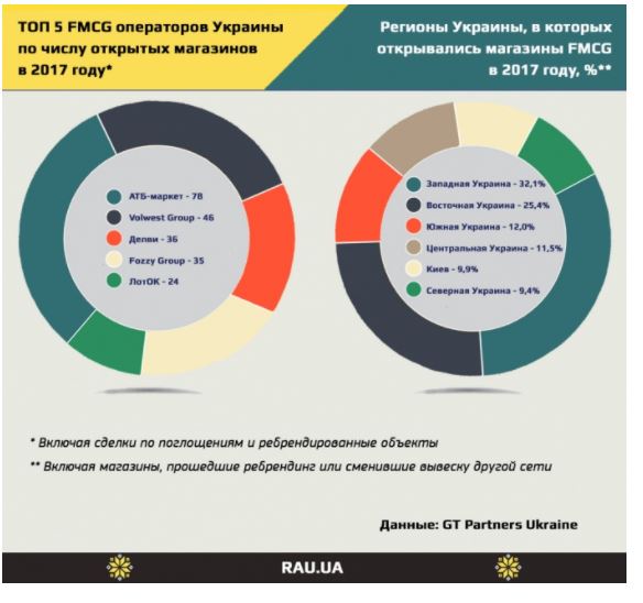У трійку лідерів за кількістю торгових точок увійшли АТБ, Fozzy і Volwest Group, передає Ukrainian Retail Association з посиланням на дослідження компанії GT Partners Ukraine.