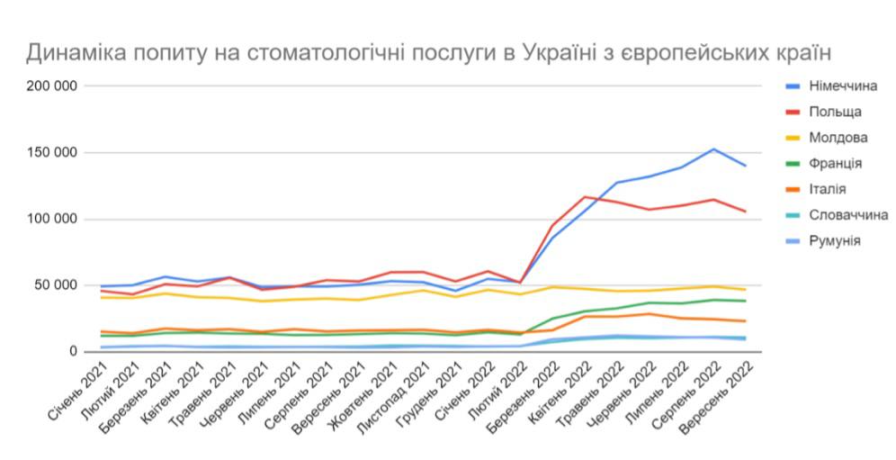 Якщо в лютому 2022 року українською стоматологією з цих країн Європи цікавилися близько 180 тис. разів, то вже у березні число виросло до 287 тис. разів на місяць, а у серпні взагалі перевищили рекордні 400 тис.